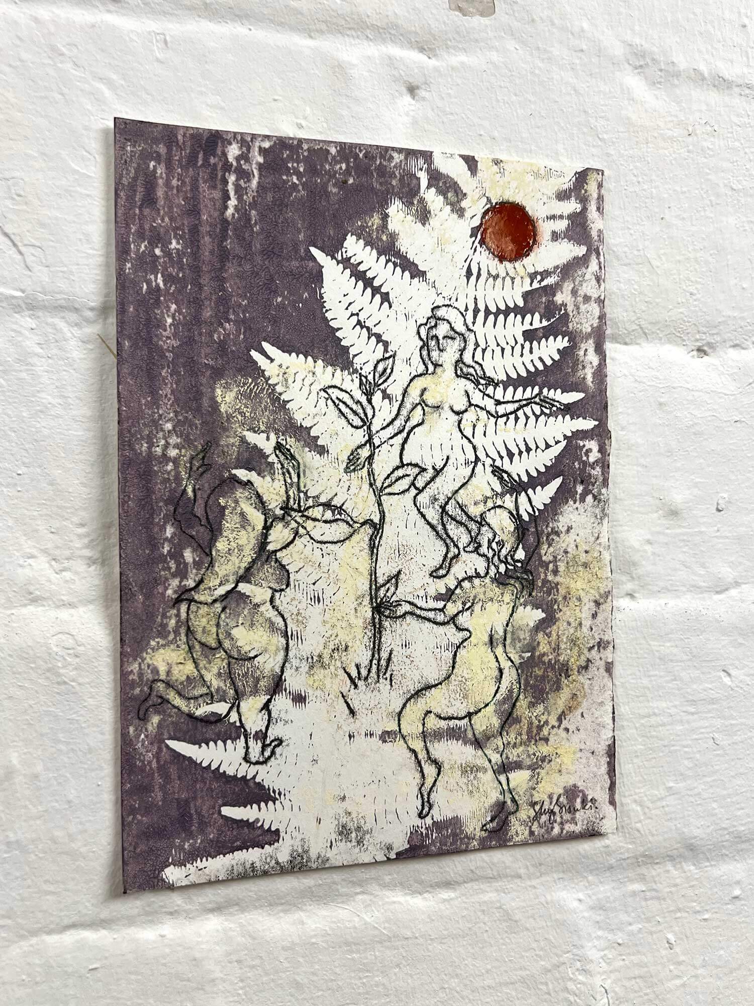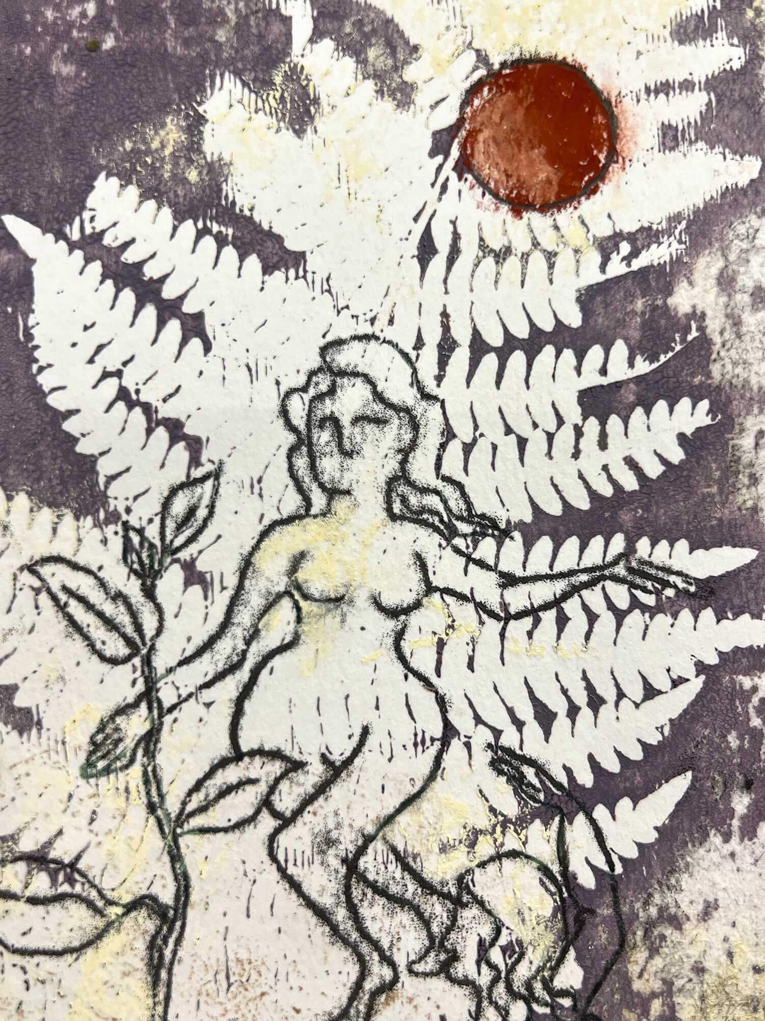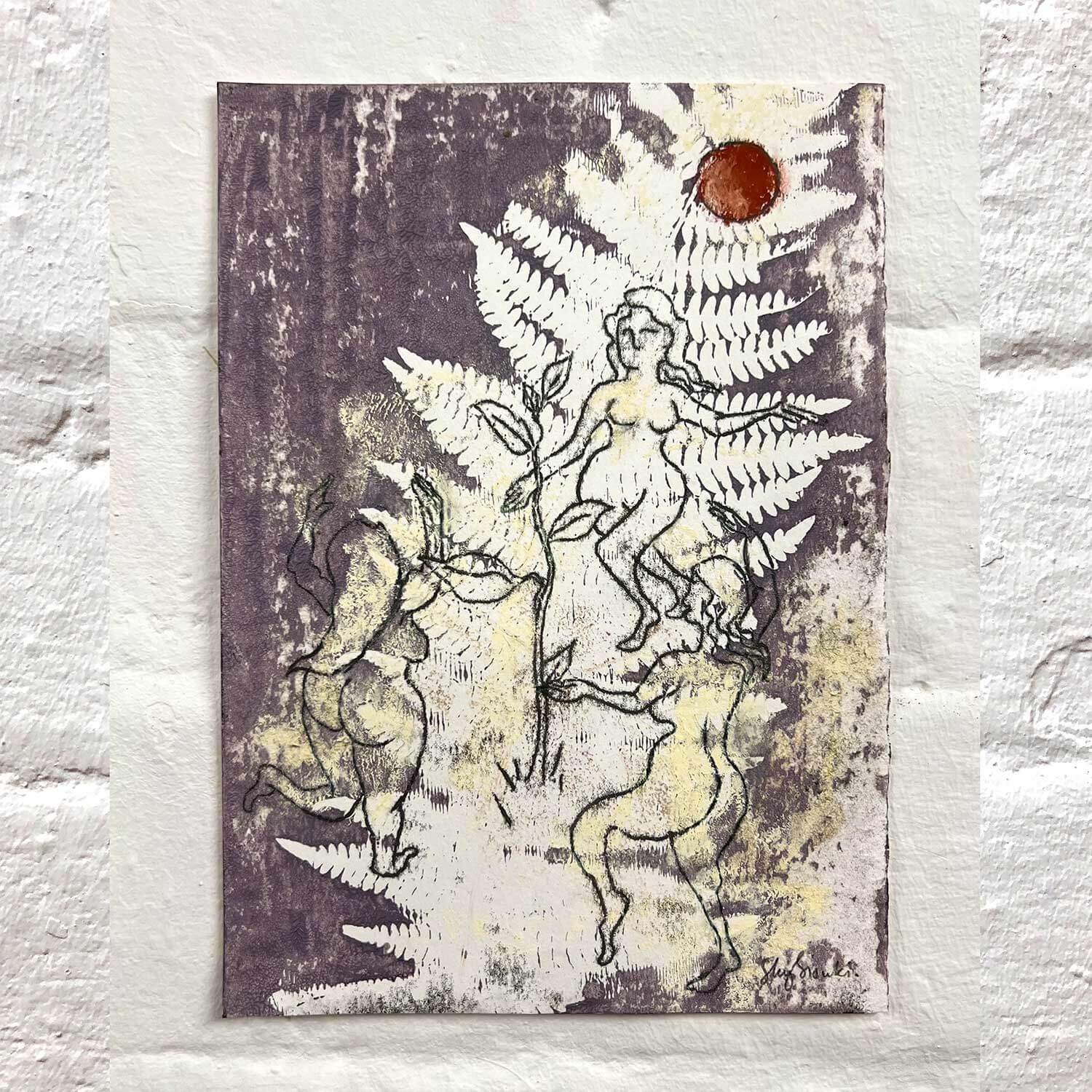 This monoprinted artwork on paper was created in two stages. Beginning with a monoprint using a pressed fern leaf sprig, and then overlaid with a monoprinted line drawing of three women dancing around a growing shoot. Finally the sun was filled in with chalk pastel.