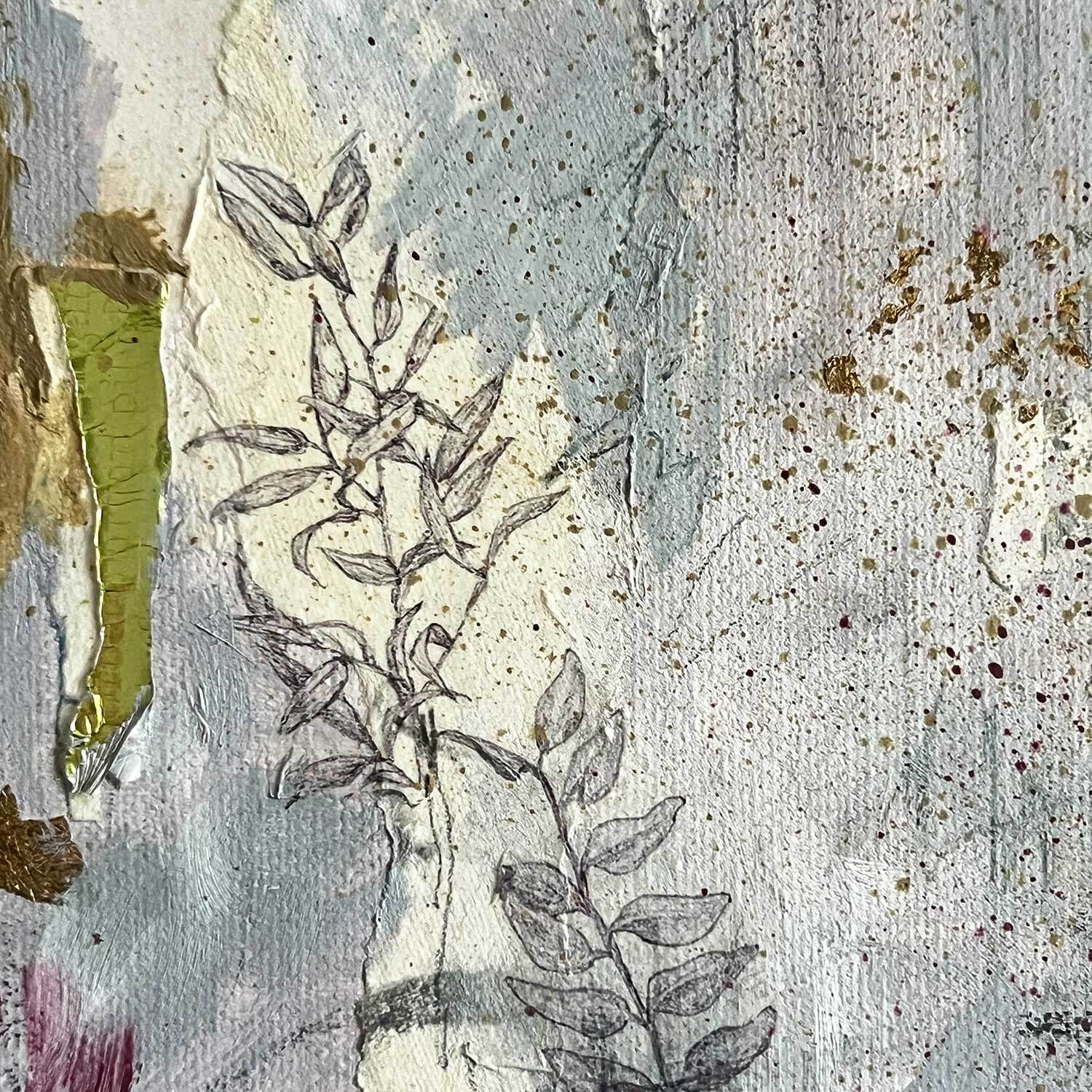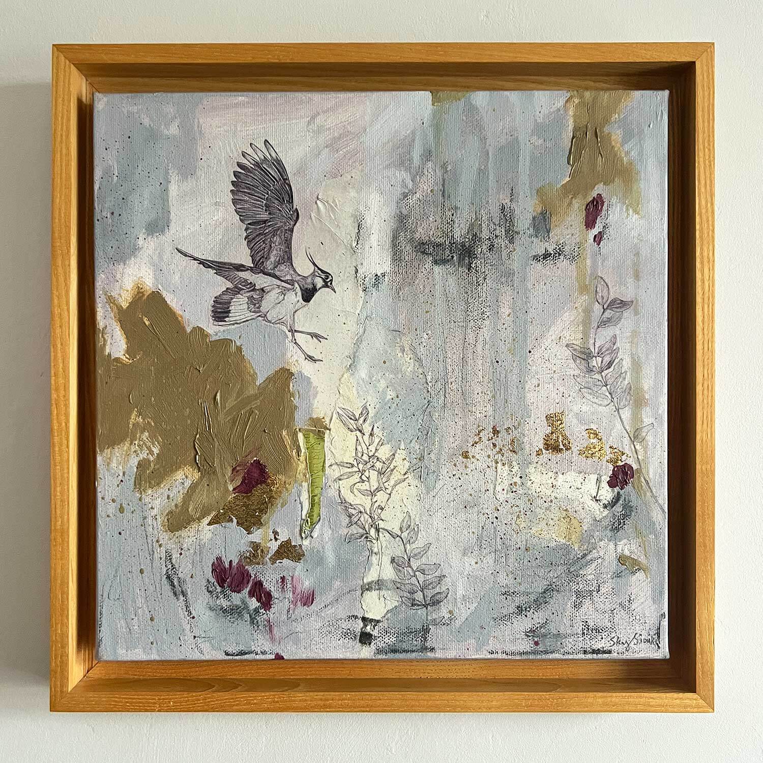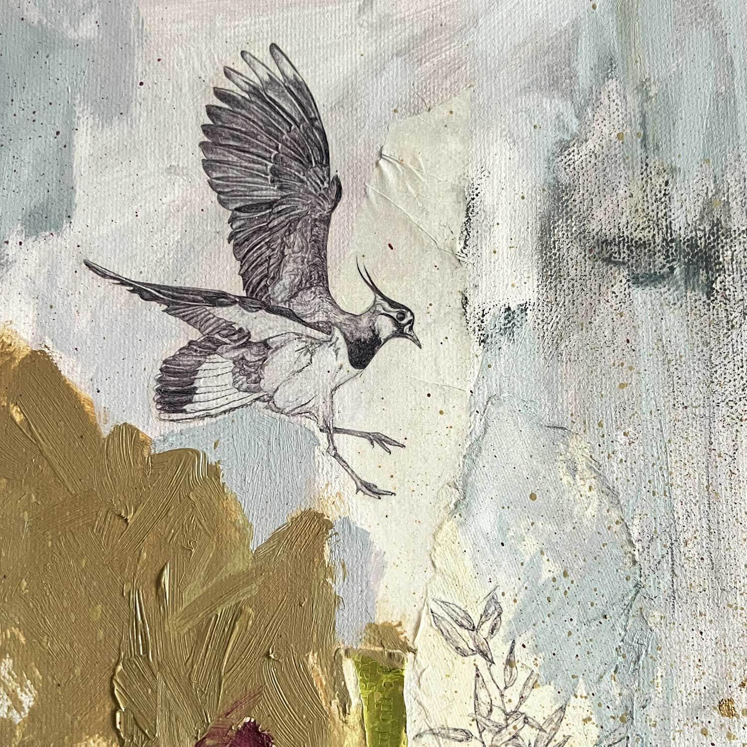 This painting has been created using a combination of medias including oil paint, acrylic paint, gold leaf, graphite and image transfers of a Northern Lapwing and foliage illustrations.