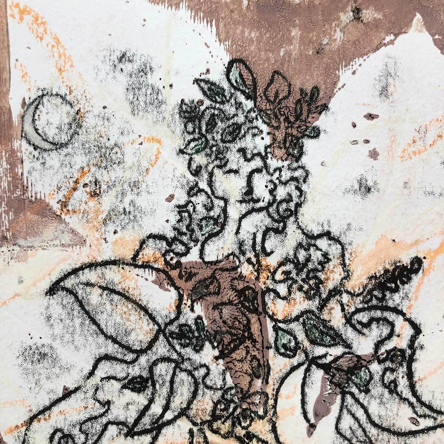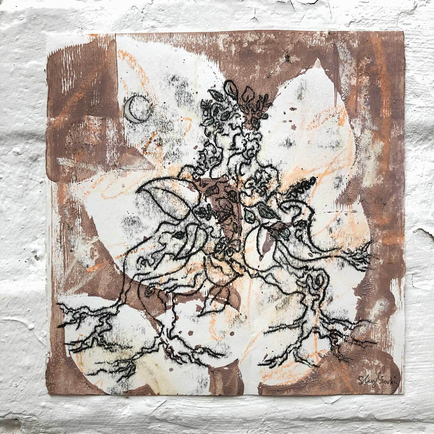 This monoprinted artwork on paper was created in stages. Beginning with a monoprint using a pressed leaf sprig and then some loose pastel marks added on top suggestive of free and fluid energy. The last layer is a monoprinted illustration of a woman embodying a tree. Some of the small leaf shapes are shaded with green pencil and the crescent moon is gently filled in with white-grey pastel.